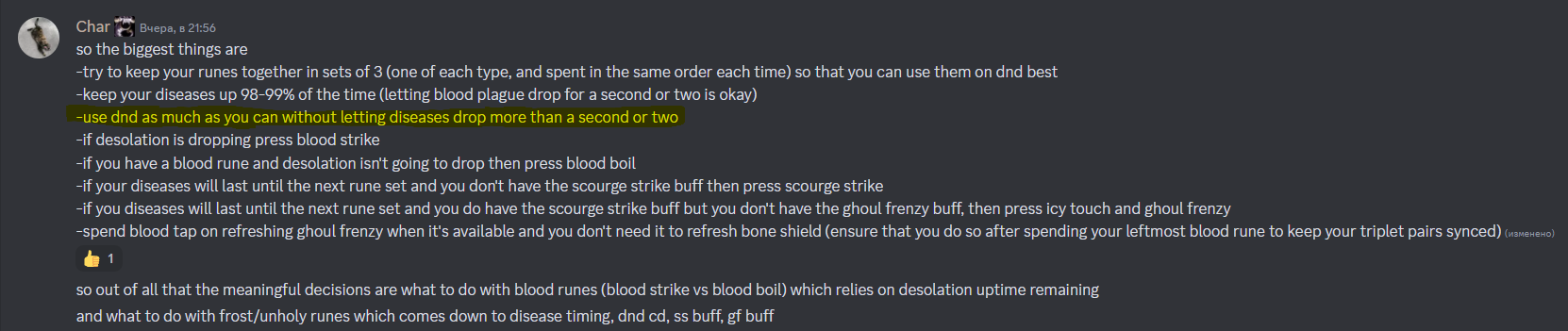 MrSergey писал(а): Опенеры реализовать не предоставляется возможным. По обычной ротации какие замечания есть? Простои с ударом плети могут быть из-за нехватки рун для лужи. Лужа более приоритетна. Но можно попробовать при иналичии Печати болезнетворности сделать лужу не приоритетной... Что думаете по этому поводу? Из видео выше после опенера нормальная ротация следующая: Ледяное прикосновение - Удар Чумы - Кровавый удар (для тригера/обновления бафа Отчаянье) - Удар плети - Смерть и разложение. Кровоотвод тратить только для обновления бафа "Бешенство вурдалака" Смерть и Разложения нельзя понижать в приоритете так как оно по прежнему наносит много урона.