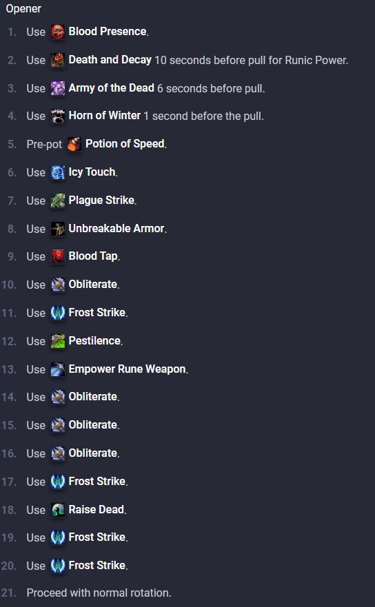 MrSergey писал(а): Просмотрел код, сравнил с гайдами - все как и должно быть. Запишите видео с боем, укажите на каких секундах по вашему мнению происходит недоиспользование Уничтожения - проанализирую. ну видео будет сделать проблемно. По поводу уничтожения - программа даёт меньше ударов, по сравнению с другим фростом в моём рейде, примерно в таком же шмоте. Да и сам, замечаю, что руны на уничтожение есть, но программа их не использует. Если совсем отключить аое режим через макрос, программа же не будет использовать ветер, правильно? А будет прожимать только при проке машина для убийств? Посмотрел логи, наша программа практически не использует кровоотвод. У меня 4 раза за весь Ульдуар, у второго фроста 55. Ниже будет ротация опенера у фроста с кровоотводом и усиленным руническим оружием, получится под неё исправить программу? Ссылка на гайд https://wowtbc.gg/wotlk/class-guides/fr ... th-knight/Без этого идёт серьёзная просадка в дпс, очень нужно исправить.