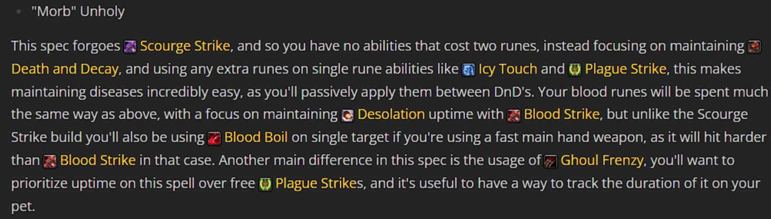 Dimonoff писал(а): Bionic писал(а): вот же ваша ротация, там всё расписано. Так по этому принципу и делалось. Говорю же если делать аптайм близкий к 100 бафа то ломается урон от лужи, фиг с ним с ББ это не столь существенно, но вот лужа это уже более важжно чем 3-6% бафа. Учитывая что прямого урона у морба %35 от общего числа. если я бью в соло цель, то расход рун крови идёт на кровавый удар (1 раз в 17-19 сек для обновления бафа) и лужу раз в 15 сек, при откате рун 10 сек, как при таких вводных данных (имея ещё кровотвод в запасе) нельзя реализовать всего 2 условия, лужа и баф 5% с максимально возможным аптаймом? ББ я вообще убрал из биндов, дамаг не даёт, а руну тратит. если берём аое ротацию, то там руна крови ещё на мор тратится, раз в 15 сек, но таких боёв не очень много и они не длинные, в плане аое.
