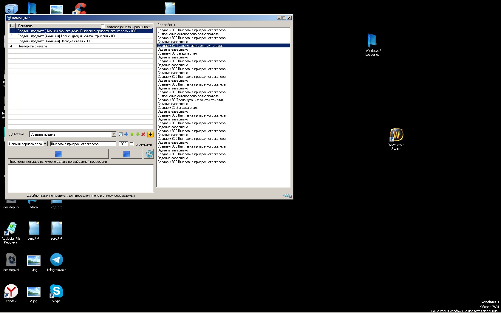 Проблема и с другим крафтом. Если создать список из нескольких заданий, делает только 1 цикл полностью, после чего только первый пункт. Такая ситуация как при запуске с нуля, так и после остановки и запуска вручную ( видно в середине лога) Аналогичная ситуация с крафтом портняжки.