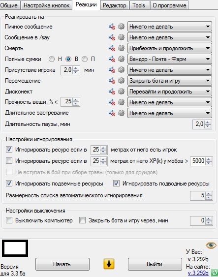 Добрый день, с недавних пор (а именно 2 дня назад) произошел печальный казус. Запустил как обычно бота на ночь, с утра встаю, висит окно дисконнекта и ошибка скрипта "[string "DoIt()"]:1 attempt to call global 'DoIt' (a nil value)". и с тех пор бот перестал автоматически перезаходить при дисконнекте. Настройки все стоят правильно. Вообще перестал реагировать на "реакцию" дисконнект. Когда происходит дисконнект счетчик времени в tools начинает идти очень медленно ( хотя вроде вообще должен переставать работать). А если вручную войти в аккаунт, то бот продолжит фармить, как ни в чем не бывало. Уже и переустанавливал бота и вов. Специально попробовал на "нелецензионном боте" (старой версии) все прекрасно работает и перезаходит. Надеюсь на вашу помощь. Заранее благодарен. Вов версии 3.3.5, бот версии v.3.292q. Если нужны какие либо скрины, либо видео могу снять и предоставить