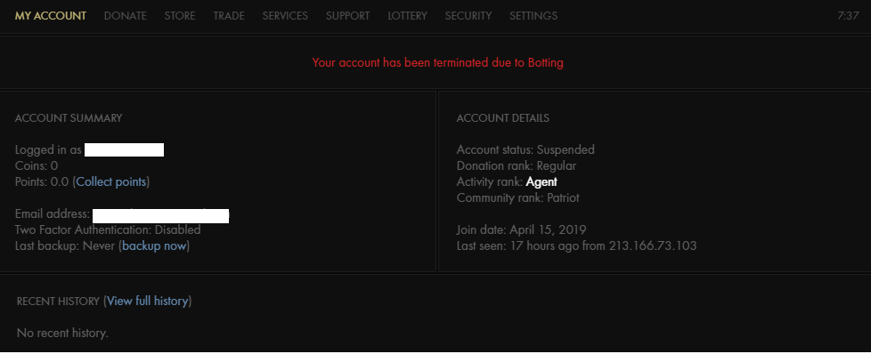 sqizi писал(а): te_di писал(а): MrSergey писал(а): Всегда есть вариант, что детектят бота... но в таком случае обычно отлетают все, а не частично... В общем, решил проверить, насколько все плохо... Оказалось, очень плохо. Написал маршрут, чтобы бот только летал, ничего не собирал, просто, чтобы летал между локациями. Пролетал бот 1 час 40 минут и, как Вы понимаете, бан. Вот пруфы Вложение: Вложение 1.png больше недоступно. Вложение: Вложение 2.png больше недоступно. А в личном кабинете не кажет как выдан бан, античит/гм? В личном кабинете бан точно такой же, как и если бы ГМ дал его руками. Разница лишь в том, что когда есть репорт ГМам от игрока, то во время бана пишется красный текст в чат ВСЕГДА. В этом же случае, боты улетают, чат чистый. Бота, который просто летал, никто не трогал (В логах это видно). Понятно же, что это палится бот, где-то есть уязвимость. Эти баны не связаны ни с количеством собранной руды, ни с количеством убитых мобов. Вложение: