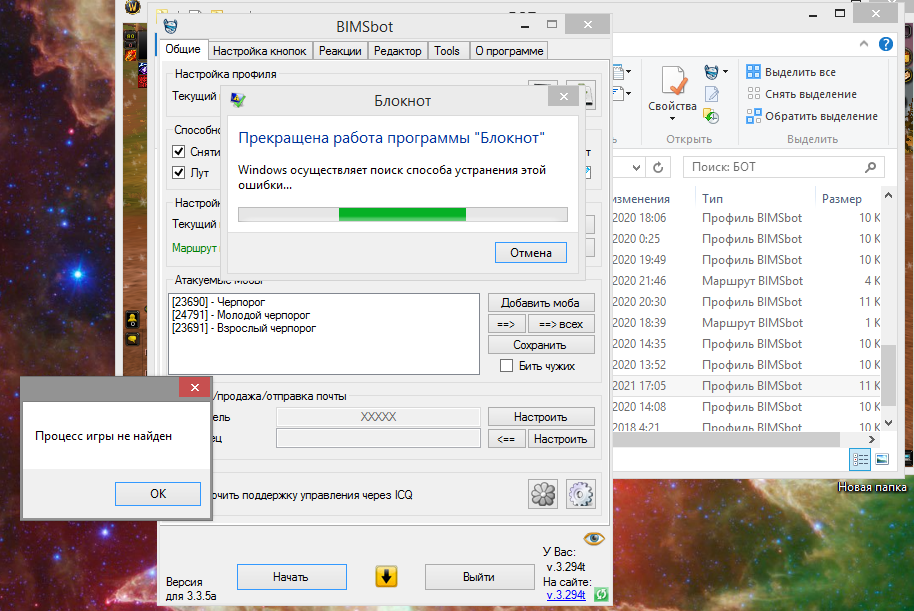 Сейчас попробовал запустить профиль из самого бота , он запустил , я нажал начать и он написал , что процес игры не найден и через секунд ё0 эта ошибка !! Походу я , что то делаю не так !!