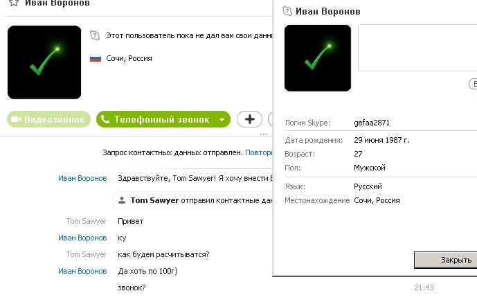 [21:42:03] Иван Воронов: Здравствуйте, Tom Sawyer! Я хочу внести Вас в свой список контактов в Skype.