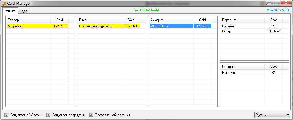 Антивирусы гурались из-за упаковщика, поэтому решил не упаковывать, счас с этим все нормально. По поводу голда в гильде - надо прощелкать мышкой по серверу - мылу и акку, тогда только появится список персов и гильдий. В новой версии сделал, чтобы голд в гильдиях отображался при клике на любом списке, начиная с сервера. Новая версия вот: Вложение: