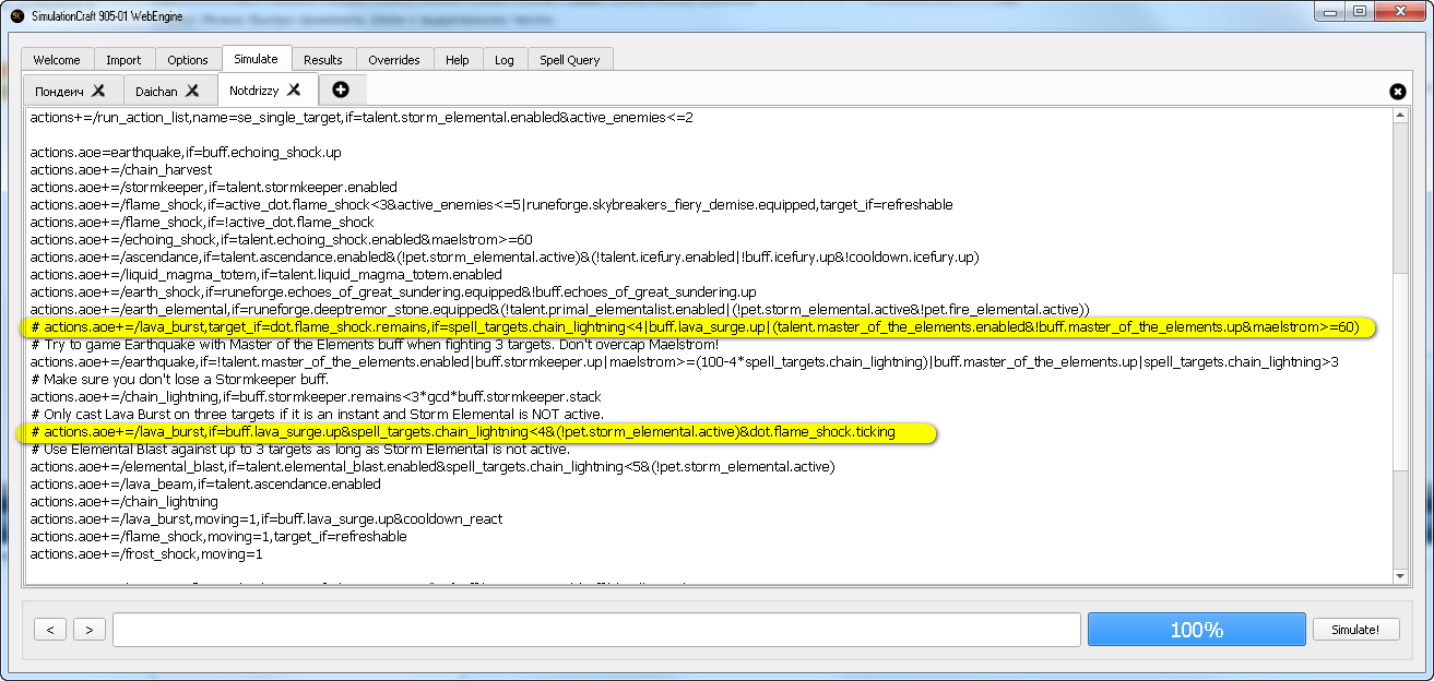 Screenshots in my previous post - I take first elemental shaman from wowlogs and simed him with Lava brust as suggestet simcraft and without it. I don't see difference, so there is no need ti change anything.