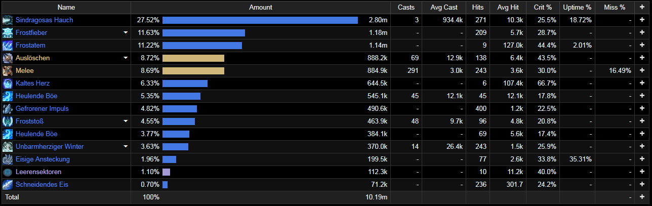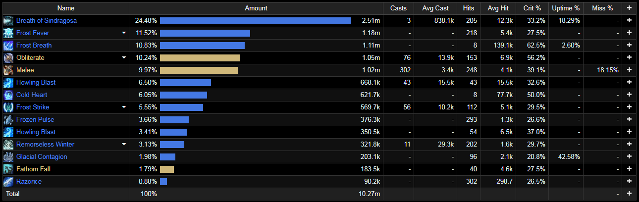 Reqqque писал(а): По логам вижу что косу дают под прок машины на 2+ таргета и при 3+ таргетах только коса без уничтожения Сам косу не тестил могу быть неправ FRATER1234 писал(а): Ну и чтоб не создавать по 100500 тем, хочу сразу тут спросить ротацию в сингл таргет сделана по http://www.simulationcraft.org/reports/T22_Raid.html ? Просто мне кажется что нет, потому что я замечал что опускал некоторые моменты в ротации от симкрафта. Есть раздел под названием Action Priority List и в нем подраздел Sample Sequence Table и там как раз видна ротация с босом в 5 мин. Может посмотрите этот момент тоже? Потому что есть предчувствие что ваша ротация не много отличается от симкрафтовской. Сравнивать в Action Priority List приоритеты и условия, но там нет аое ротации По поводу Action Priority List я хочу чтоб они посмотрели в сингл таргет. Просто я смотрю что написанно там и смотрю как работает программа она вообще розница. Допустим я уже вижу по логам что сразу ни кто не сдает столб и оковы, плюс люди набирают больше РП до 80 а не до 55 и потом просто слив через ледяной удар. Ну много тонкостей просто им стоит реально пересмотреть ротацию сингл. А то по сим крафту я должен давать 16к а даю на самом деле 14к