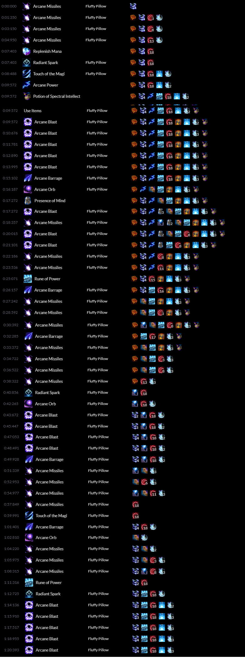 По идее, идеальный вариант, настакать 2 ясности мысли и 4 чародейских заряда, потом 3 раза проюзать стрелы, что бы добить 18 стаков, после, если до бурста меньше 10 сек(тут, если честно, не знаю, сколько лучше ждать бурста), ждать бурста, прожимка мощи тайной магии, касания мага, 3 вспышки и потом чародейский обстрел, далее (то, что и при долгом ожидании бурста), набивание вспышками 4 чародейских заряда и 2 ясности мысли, и также 3 стрелы, при отсутствии кд использовать искру и касание мага, 3 вспышки и один чародейский обстрел. Руну и величие разума использовать по кд, перед началом вспышек.