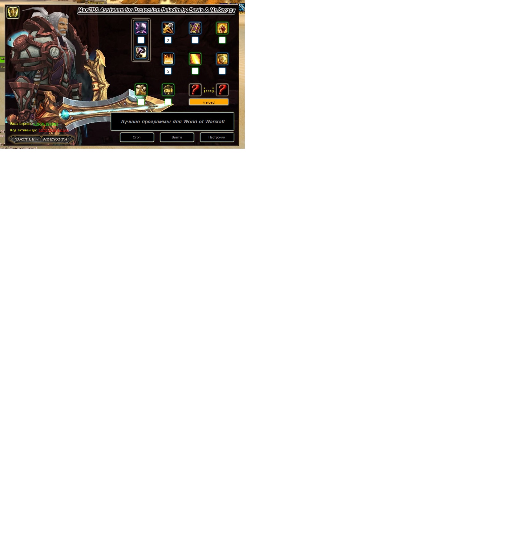 Программа ка бы пошла, НО ..... Я назначил 2 кнопки на удары, и в том окошке назначения кнопок которое активна при включении программы, сразу после включения пишет Reload И в игре при нападении например мобов, не чего не происходит ...Что не так в этот раз ? Бот на пиратке, версия 3,3,5, лвл чара 46, пал танк