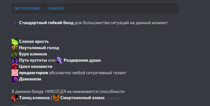 Хочу внести предложение по корректировке использования "Пронзающего взгляда" при взятом таланте "Слепая ярость" с дефолт билдом(прикрепил скрин) - сейчас бот использует взгляд когда у нас от 30 до 50 ед. гнева, но бывают рандомные ситуации когда секунд 5-10+ мы не прожимаем "Пронзающий взгляд"(это большая потеря дпса) происходит это потому что происходит рандом регена раги с помощью "Укуса демона" + таланта "Неумолимый голод" и у нас часто гнева больше 50 либо меньше 30 и бот разумеется не жмёт взгляд, предлагаю увеличить до 65 ед. гнева вместо 50. (Могу прислать видео таких больших фатальных простоев неиспользования взгляда на маникене либо в рейде/мификах) В БВА это было актуальная информация т.к талант "Цикл ненависти" был не метовый + в ШЛ-е близы дефолтный Яростный взор завезли по достижению 60 лвла - https://ru.wowhead.com/spell=343312/%D1 ... 0%BE%D1%80 который дает 15% хасты на 12 сек - соответственно взгляд по КД в очень большом в приоритете.