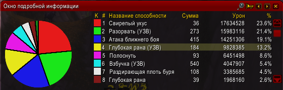 Тест 1 (5 минут) (азеритовый талант внес свои коррективы в дпс, но на скрине отчетливо видно, что свирепый укус на 4 месте)