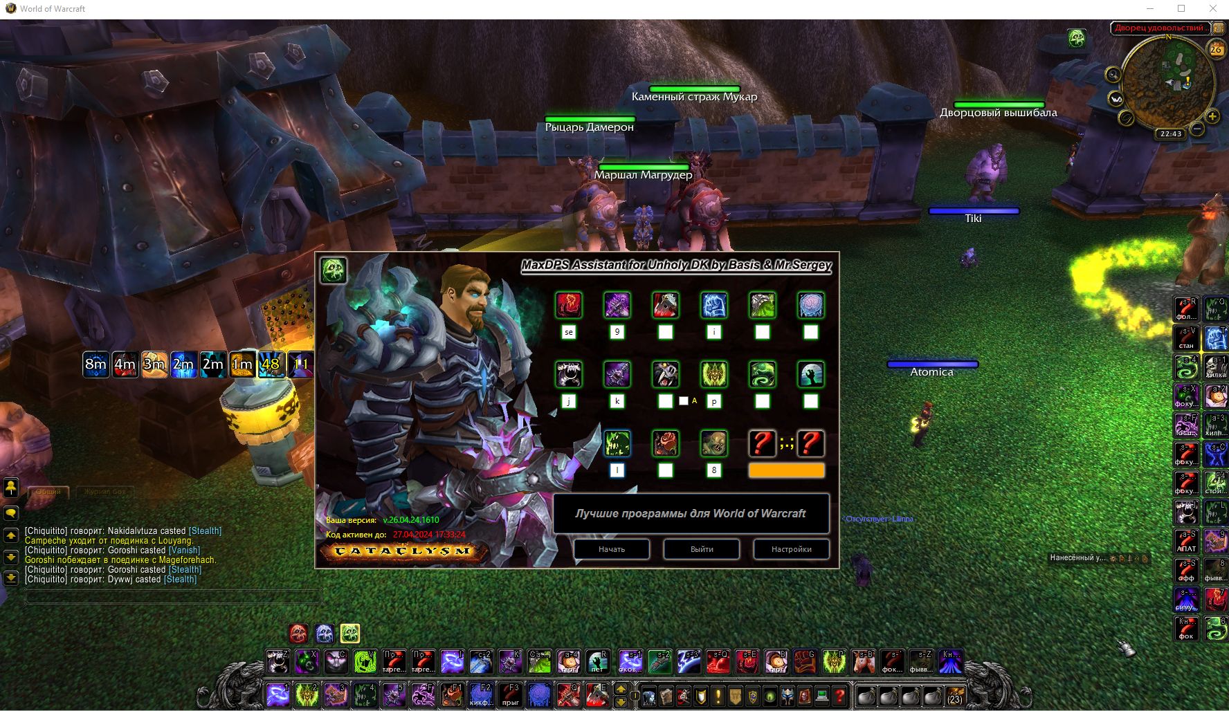 Приветствую! играл последние несколько дней с версией 12ого года, было +-норм, вчера максдпс обновился, сейчас бот начинает ротацию со вспышки болезней(вешает мгновенно две доты) и нормально работает, ровно до момента когда доты заканчиваются, после последнего тика бот отказывается обновить доты УЧ и ЛП, и прост стоит бьёт автоатакой, если убрать бинд вспышки болезней, то бот вообще ничего не жмёт... (старая версия нормально обновляла доты) Если вручную повесить доты, бот всё равно ничего не жмёт...
